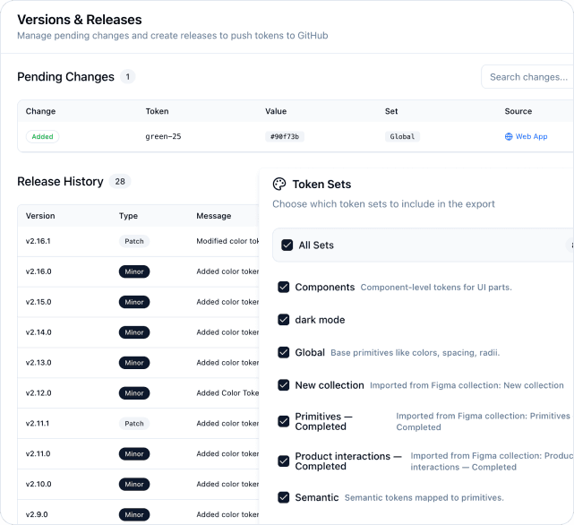 Track changes, create releases, and manage your design system evolution with semantic versioning.